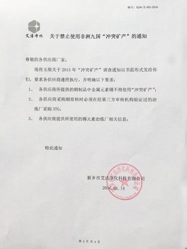 關(guān)于禁止使用非洲九國沖突礦產(chǎn)的通知 我公司提出關(guān)于禁止使用非洲九國沖突礦產(chǎn)的通知,請各供應商嚴格按照要求實施!