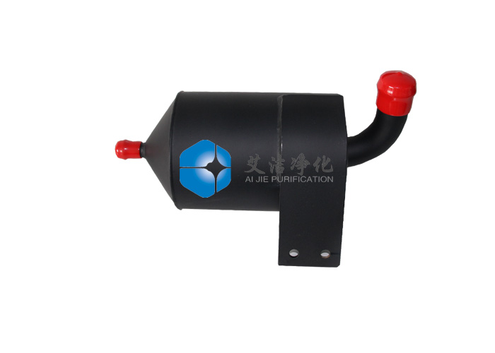 艾潔凈化生產的旋風式油氣分離器是讓氣液混合氣經過切向進氣道或是螺旋進氣道進入分離器內,使混合氣在分離器內旋轉運動,以此產生離心力來實現油滴的分離,它的分離機理與主動離心式油氣分離器相同,只是不需外界提供動力。